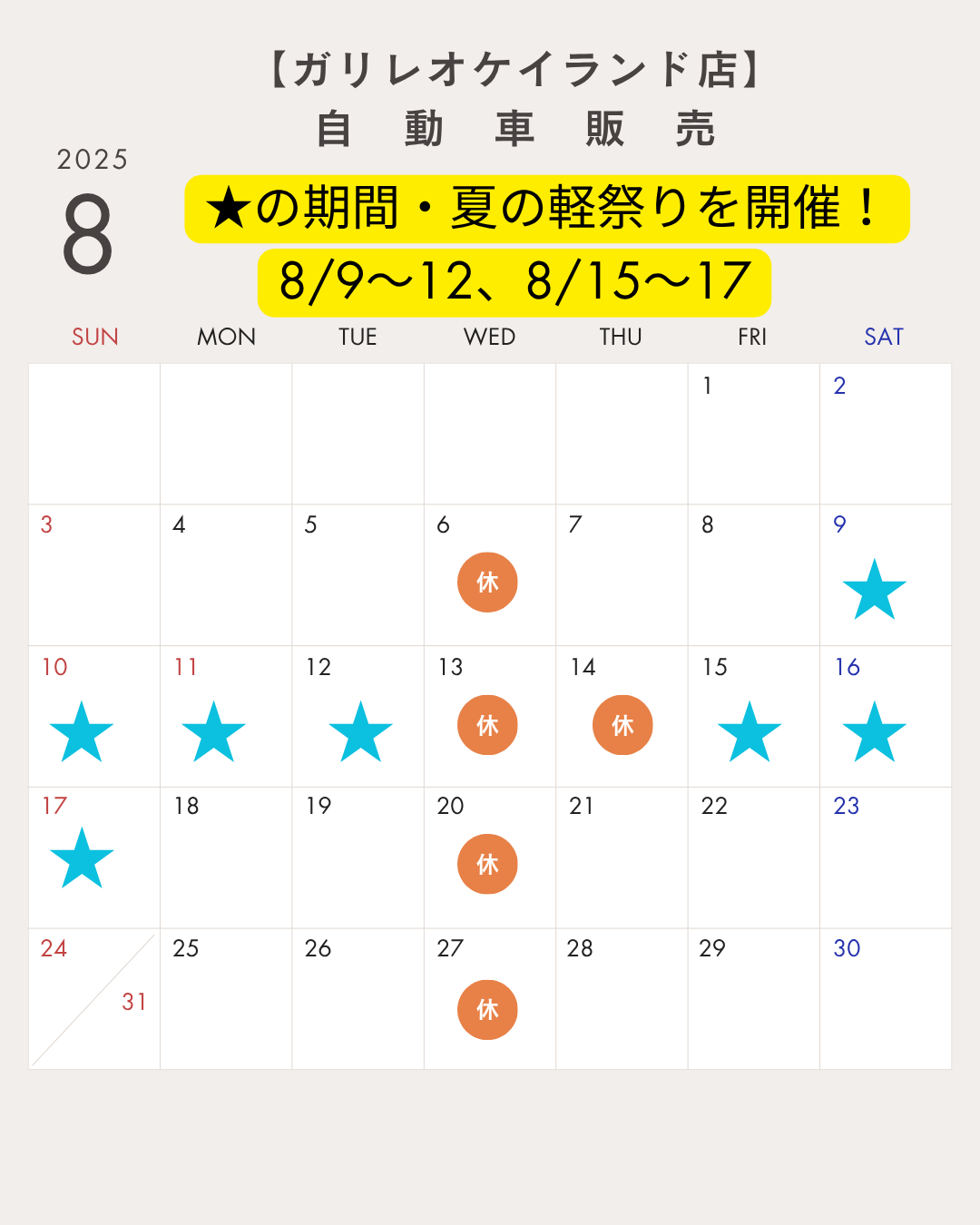 ガリレオケイランドでは8月9日~17日の期間、「夏の軽祭り」を開催しておりますので